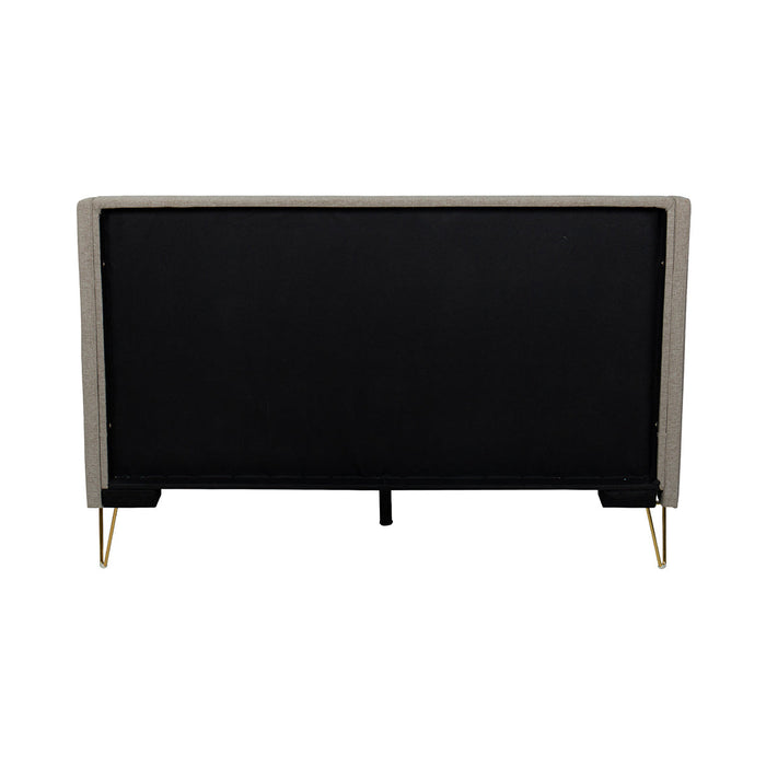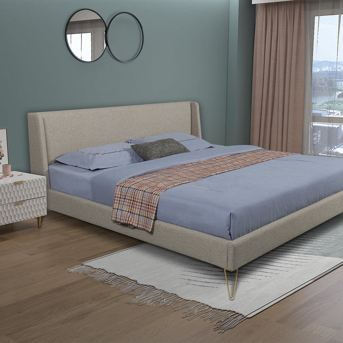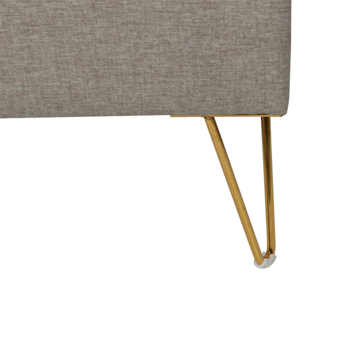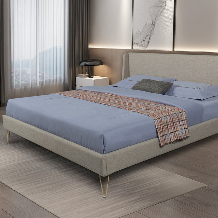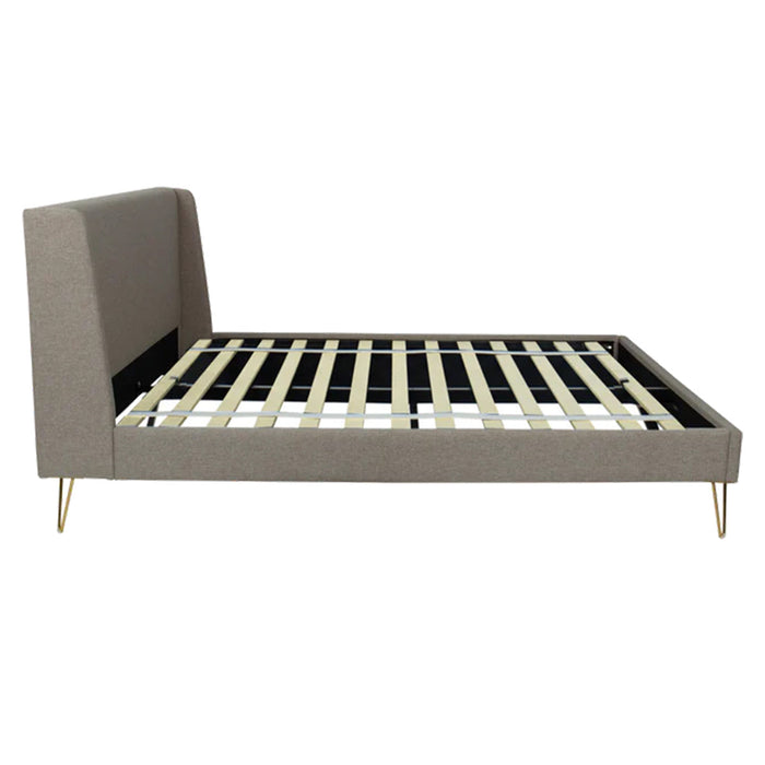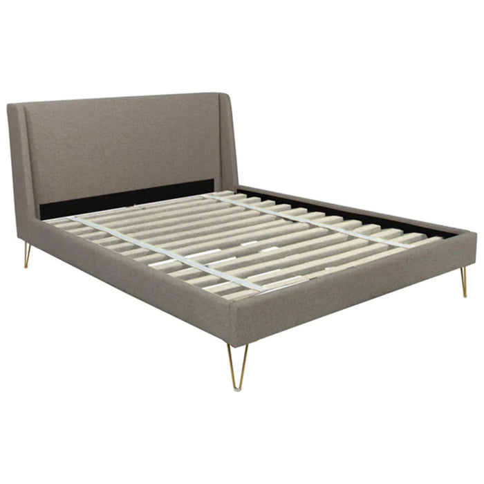 Make a statement in the bedroom with this elegant and chic bed frame. This fully upholstered bed features comfortable grey fabric with unique angled brass legs. The dainty legs offer sturdy support with a couture feel.