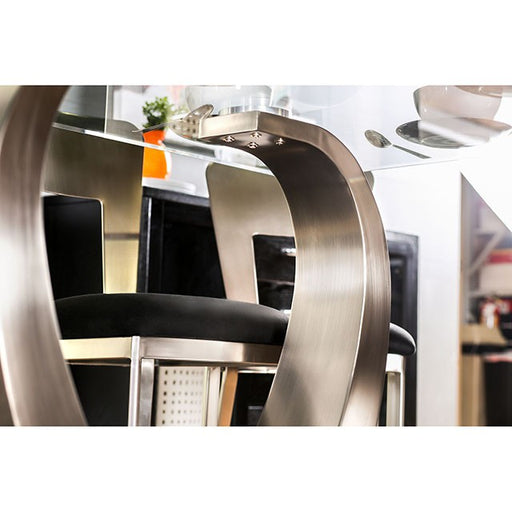 NOVA Satin Plated/Black End Table, 26"DIA X 22 1/2"H, 40.2lbs. Add a modern artistic air to your living space with this living room tables set, showcasing tempered glass table tops supported by unique twisting pedestals. Features: Contemporary Style 8mm Beveled Tempered Glass Top Twisting Pedestal Metal, Others Satin Plated Finish