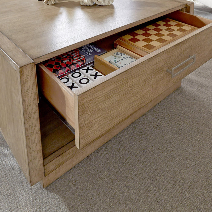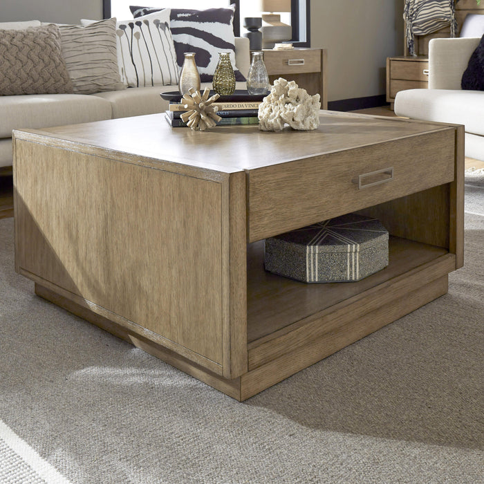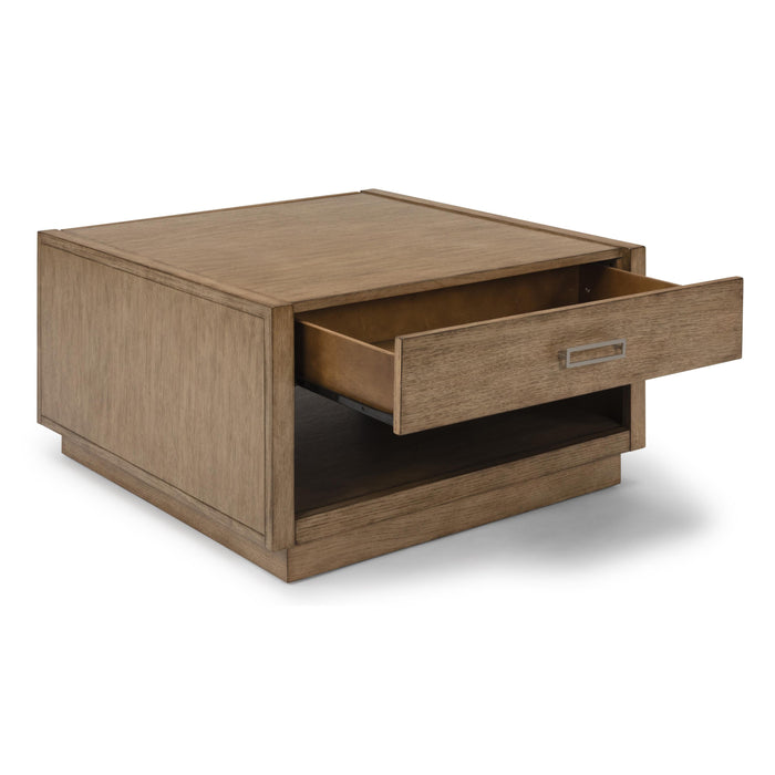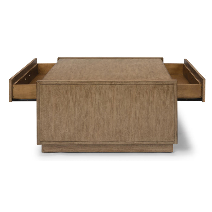 California contemporary design with a slightly weathered driftwood, natural brown oak finish. The Montecito Coffee Table by homestyles is crafted from hardwood solids and straight grain oak veneers over engineered wood. Solid wood surfaces have a wire-brushed texture, providing a weathered look. Two upper drawers on each side, with lower open storage area. Unique open-handle drawer pulls in a brushed nickel finish. Raised plinth base adds to the straight-line contemporary design. Ideal for use with sectional, or with sofa and love seat combinations. Finish and measurements may vary slightly. Arrives at your door by parcel delivery service. Assembly required. Measures: 19"H x 36"W x 36"D. Features: - Crafted from hardwood solids and straight grain oak veneers over engineered wood with a wire-brushed texture - Two upper drawers on each side, with lower open storage area - Unique open-handle drawer pulls in a brushed nickel finish - Ideal for use with sectional, or with sofa and love seat combinations