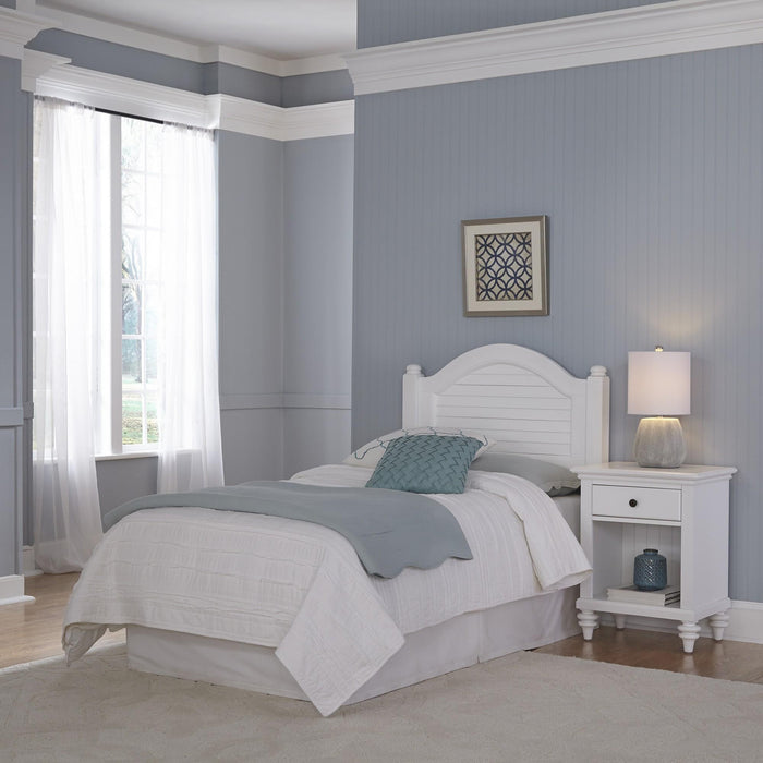 Inspired by the fusion of British traditional and old world tropical design, the Penelope Collection highlights mahogany solids and engineered wood in a designer hand-applied visible brushed stroke white finish. Further inspiration can be found in the shutter style design and turned feet. This twin headboard and Nightstand would make a perfect addition to a guest room or teen bedroom. Nightstand features a storage drawer and lower storage area. Antique brushed nickel hardware. Finish and measurements may vary slightly. Set includes headboard and Nightstand. Assembly required. Headboard Size: 41.5w 3.75d 48h. Nightstand Size: 22w 16d 28h. Features: - Constructed of mahogany solids and engineered wood in a refreshing, textured-brushed white finish - Shutter style design, turned feet, and antique brushed nickel hardware - Accommodates a twin-sized mattress and box spring (frame not included) - Nightstand features a storage drawer and lower storage area