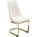 The Vogue Dining Chair by Diamond Sofa provides a regal addition to your dining area. The set includes (2) chairs, each piece featuring a polished gold stainless steel frame that supports a seat and back finished in a plush Cream velvet with an exquisite "V-Tufted" design detail. The Vogue Dining Chair will instantly update the look and feel of its surroundings in your home. Entertain your friends and family with the stylish detail of the Vogue Chair.