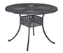 This Grenada 5-piece dining group includes a 42"D table and four arm chairs with cushions. The table and chairs feature a UV-resistant cast aluminum frame, with a powder-coated finish that is sealed with a clear coat. Table size: 42"W x 42"D x 28.75"H. Chair size: 23.25"W x 24"D x 36"H. Features: - This set consists of round dining table and four arm chairs with cushions. Umbrella not included. - Weather-resistant polyester cushions combine cozy comfort with lasting performance - Cast aluminum frame is designed to withstand the elements - Table includes a hole in the center for an umbrella, with a cap to cover it