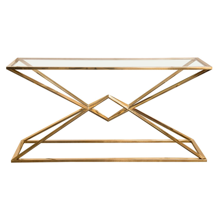 Aria Rectangle Stainless Steel Console Table w/ Polished Gold Finish Base & Clear, Tempered Glass Top by Diamond Sofa