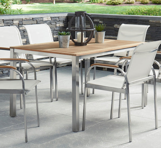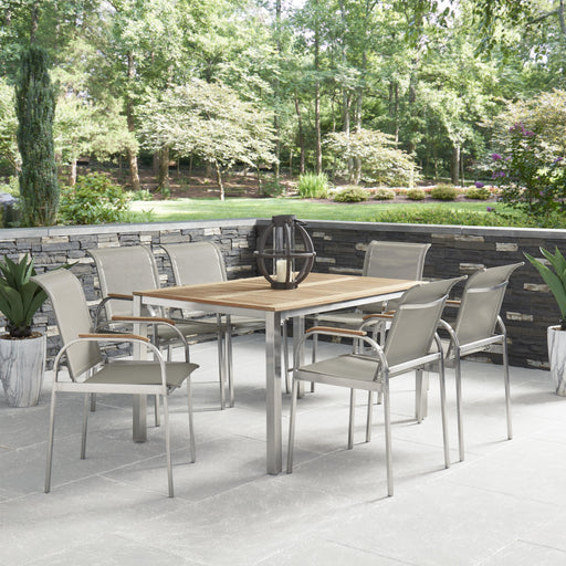 Lounge outdoors in comfort and style with the Aruba 7-Piece Gray Outdoor Dining Set by homestyles. The table and six chairs have polished stainless steel frames that are weather-resistant. The slatted solid teak table top and arm pads are finished with natural linseed oil to be water-resistant. Each chair features a contemporary sling-style seat and back, built to withstand the elements. The lower- and upper-back frame supports add both stability and comfort. Table: 30.5"H x 53.75"W x 36"D. Chair: 36.25"H x 21"W x 25.5"D. Features: - Table and six chairs have polished stainless steel frames that are weather-resistant - Slatted solid teak table top and arm pads are finished with natural linseed oil to be water-resistant - Chairs feature a contemporary sling-style seat and back - Weather-resistant polyester cushions combine cozy comfort with lasting performance