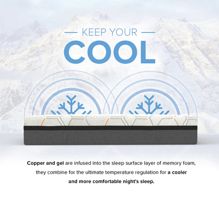 The 14" Hybrid Copper-Gel Infused Memory Foam Mattress combines comfort, vitality, and the benefits of copper in your bedroom. Copper is an essential trace mineral found in the liver, brain, heart, kidneys, and skeletal muscle. It has numerous health benefits and has been known to increase collagen production, energy levels, iron absorption, and antimicrobial properties. The sleeping surface of this specialty mattress is made with a plush 3” of Copper-Gel Infused Memory Foam. The conforming copper layer will aid in temperature regulation and can aid in feeling rejuvenated. Foam-encased coils accompany this premium layer for a beautifully plush sleep surface reinforced with the right amount of support. Compatible to use with an adjustable base; sold separately.