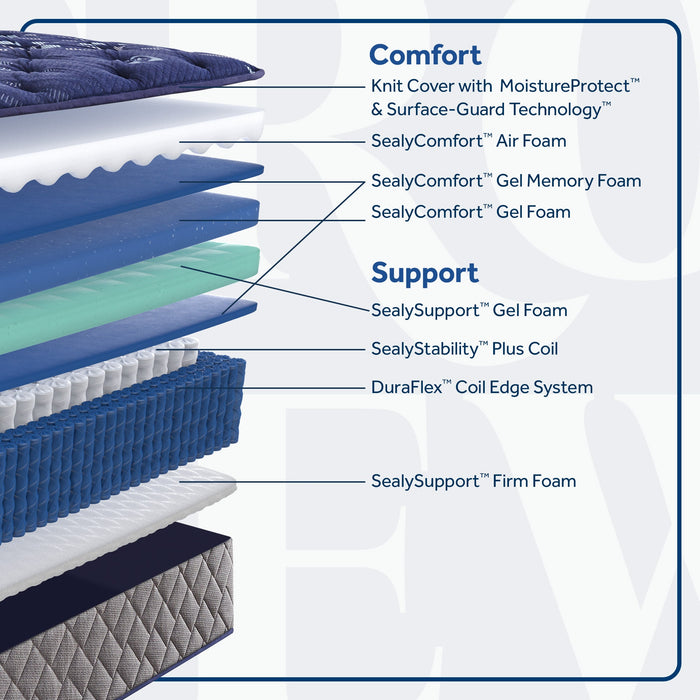 Layers of Sealy® gel foams combine with densely packed encased coils to deliver personalized, flexible, breathable comfort with conforming support and a medium feel.