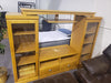 Pier style entertainment center. Maple Finish. Storage drawers at bottom. Glass doors.