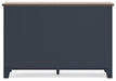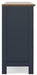 - Two-tone finish features a dark slate blue with a light brown wood-tone top
