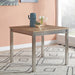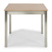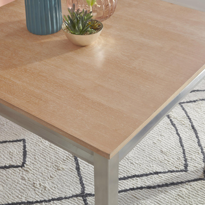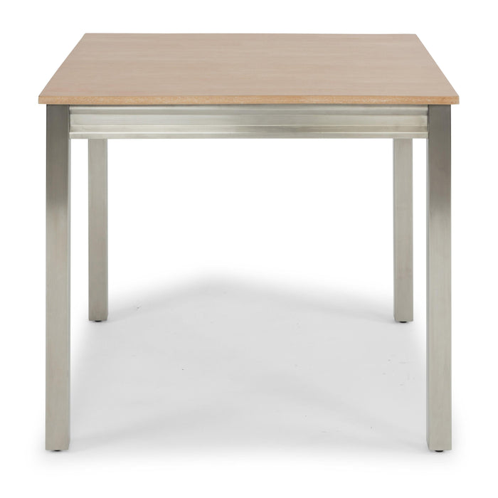 Casual dining with lasting style. The Sheffield Dining Table by homestyles features a rubber wood veneer tabletop in a natural whitewashed finish with the strength and durability of a stainless steel frame and legs. Perfect for intimate gatherings, the table is designed to easily fit four chairs. Arrives at your door by parcel delivery service. Finish and measurements may vary. Assembly required. Measures: 30"H x 36"W x 36"D. Features: - Stainless steel frame and legs - Rubber wood veneer tabletop in a natural whitewashed finish - Easily fits four chairs - Arrives at your door by parcel delivery service