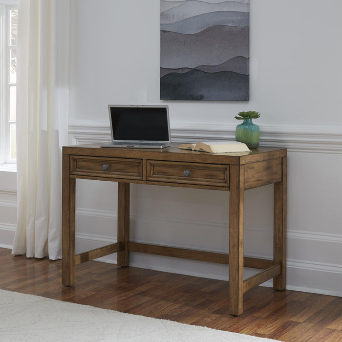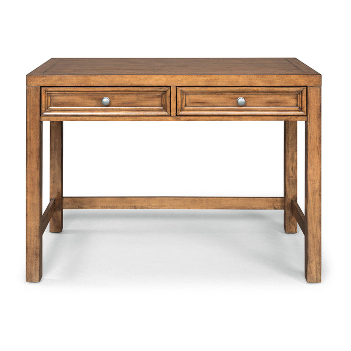 Contemporary design with a rustic aged toffee colored finish provides a great work area for smaller spaces. Crafted from popular solids and cherry veneers over engineered wood, with actual handed applied aged cracks and distressing in the wood to give an authentic rustic finish. 2 framed paneled lap drawers with brushed nickel drawer pulls. Side and back stretchers for added stability. Note finish and measurements may very slightly, assembly required. W-44", D-23.75", H-31.25" Features: - Crafted from poplar solids and cherry veneers over engineered wood, with hand-applied, aged cracks and distressing - Features an aged toffee-colored finish - Two frame-paneled lap drawers with brushed nickel drawer pulls - Side and back stretchers add stability