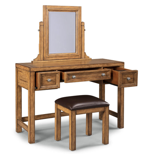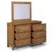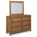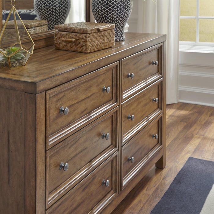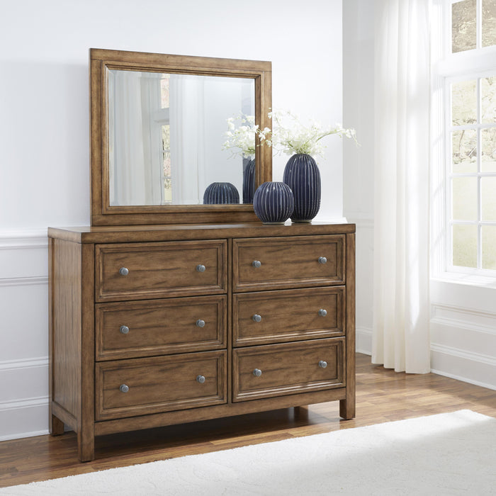 Contemporary design with a rustic aged toffee colored finish. Crafted from mahogany solids and cherry veneer over engineered wood, with actual hand applied aged cracks and distressing in the wood to give an authentic rustic finish. Top 2 drawers feature felt bottoms, to protect delicate items. All drawers are 14.75" deep with a 6.5" height. Drawers fronts are framed, with antiqued nickel finished drawer pulls. Mirror is solid mahogany with molded frame and beveled mirror glass. Mirror mounts are included as well as wall hanging capability and can be hung either vertical or horizontal position. Note finish and measurement may vary slightly, assembly required. Dresser: W-52.75", D-18", H-36"; Mirror: W-31.5", D-1.25", H-37.5" Features: - Crafted from mahogany solids and cherry veneers over engineered wood, with hand-applied, aged cracks and distressing for an authentic rustic aesthetic - Features an aged toffee-colored finish - Top two drawers feature felt bottoms, with four additional storage drawers - Drawer fronts are framed with antiqued nickel-finished drawer pulls