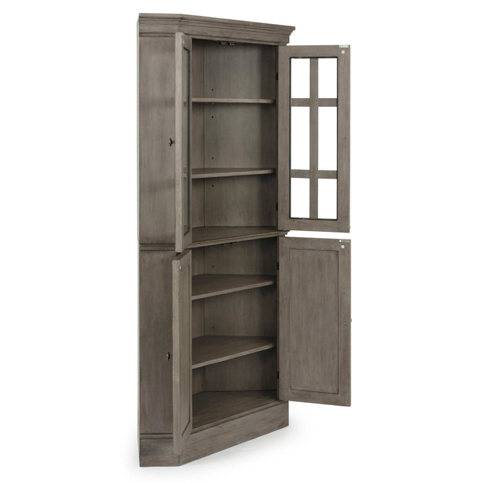 Rustic casual design that is equally at home in a Walker or mid-town loft. The Walker Corner Cabinet by homestyles is crafted of poplar solids and veneers with engineered woods and wire-brushed surfaces, providing a rough-hewn look. Inset wainscot panels with X-frame design cabinet doors. Finished in a multi-colored gray that adds unique highlighting to the design. Two upper doors feature tempered glass with outer molding, opening to two adjustable shelves. Lower doors open to two adjustable shelves. Door pulls are antiqued nickel-finished. Arrives at your door by parcel delivery service. Finish and measurements may vary, with assembly required. Measures: 72"H x 40.5"W x 16.25"D. Features: - Crafted of poplar solids and veneers with engineered woods - Surfaces wired-brushed to provide a rough hewn look - Finished in a multi-colored gray with inset wainscot panels and X frame design on cabinet doors - Two upper doors feature tempered glass with outer molding, opening to two adjustable shelves, and lower doors open to two adjustable shelves